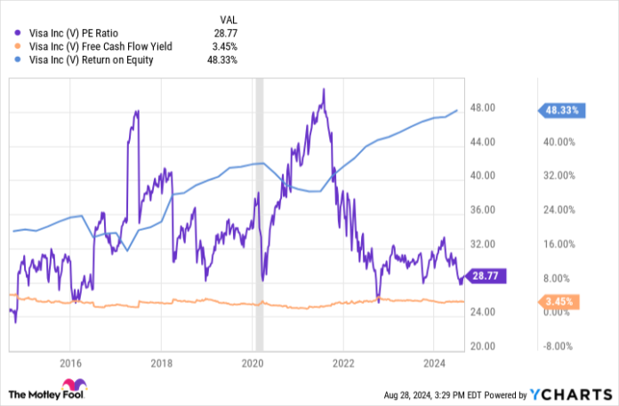 Large-industry consolidation mixed with an asset-light enterprise mannequin has resulted in big and regular income for Visa. Its returns on fairness are extremely spectacular contemplating the corporate employs a conservative quantity of leverage. Free-cash-flow era has almost all the time been optimistic. And after a small correction, shares now commerce at almost their least expensive ranges in years on a price-to-earnings foundation.