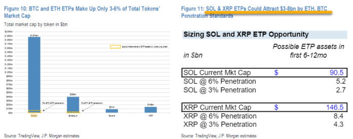 JPMorgan Chase expects that potential Solana (SOL) and XRP exchange-traded funds (ETFs) may see multi-billion greenback inflows.