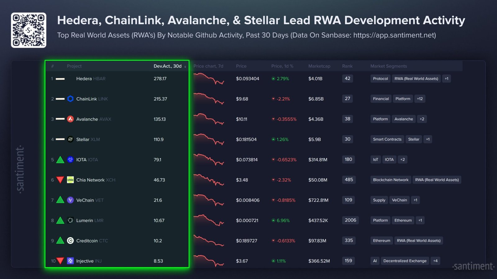 Santiment is sharing its newest RWA improvement rankings, which observe notable GitHub exercise over the previous 30 days. Hedera ranked first, overtaking different main initiatives within the sector.