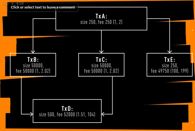 ดูกราฟตัวอย่างธุรกรรมข้างต้น อัตราค่าธรรมเนียมจะแสดงอยู่ในวงเล็บ (อัตราค่าธรรมเนียมระดับบนสุด และอัตราค่าธรรมเนียมระดับล่าง) นักขุดที่กำลังมองหาธุรกรรม E อาจจะรวมมันไว้ในบล็อกถัดไป ซึ่งเป็นธุรกรรมขนาดเล็กที่จ่ายค่าธรรมเนียมสูงมากโดยมีบรรพบุรุษขนาดเล็กเพียงคนเดียว อย่างไรก็ตาม หาก mempool ของโหนดเต็ม มันจะดูธุรกรรม A ที่มีลูกขนาดใหญ่สองคนจ่ายค่าธรรมเนียมสัมพัทธ์ต่ำ และมีแนวโน้มที่จะขับไล่หรือไม่ยอมรับ และเก็บไว้หากเพิ่งได้รับ