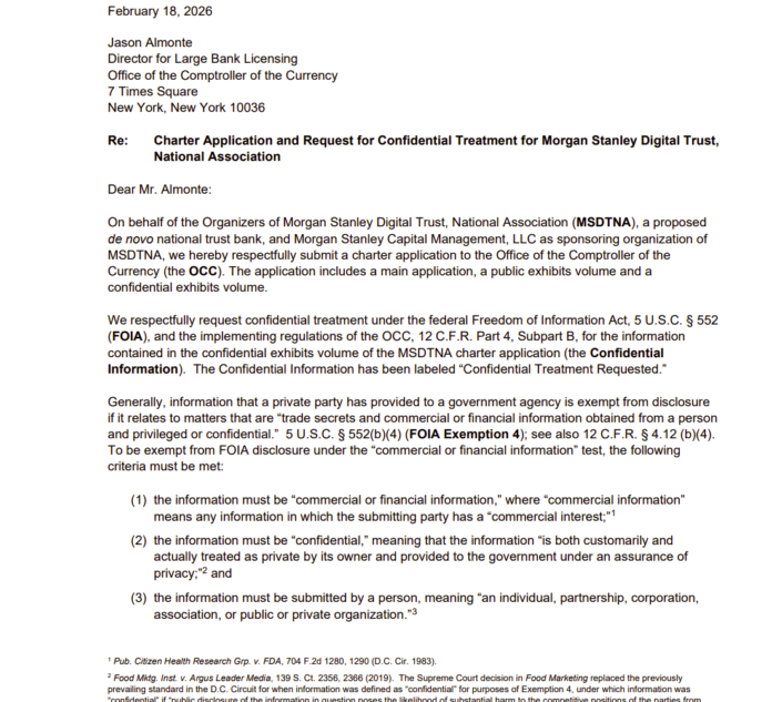 Morgan Stanley ได้สมัครกับสำนักงานบัญชีกลาง (OCC) เพื่อจัดตั้งธนาคารทรัสต์สินทรัพย์ดิจิทัลโดยเฉพาะ