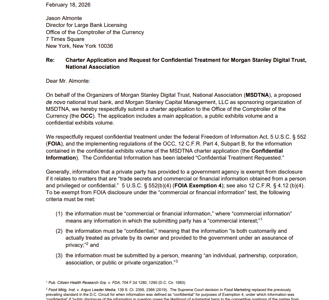 ตามคำฟ้อง ที่ตีพิมพ์ เมื่อวันที่ 27 กุมภาพันธ์ หน่วยงานที่เสนอ Morgan Stanley Digital Belief, Nationwide Affiliation (MSDTNA) จะดำเนินการในฐานะธนาคารทรัสต์ที่ได้รับใบอนุญาตระดับประเทศ โดยมุ่งเน้นที่บริการดูแลสินทรัพย์ crypto