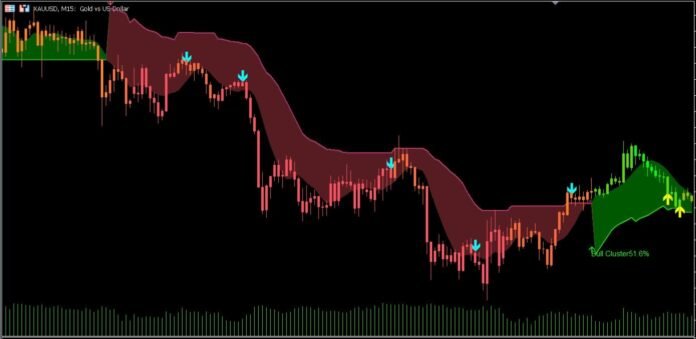 ลูกศรสีเหลือง (▲) บ่งชี้ถึงจุดเริ่มต้นที่แข็งแกร่ง ลูกศรสีฟ้า (▼) บ่งบอกถึงจุดเข้าระยะสั้นที่แข็งแกร่ง สิ่งเหล่านี้จะปรากฏขึ้นเมื่อฉันทามติของคลัสเตอร์เปลี่ยนไป