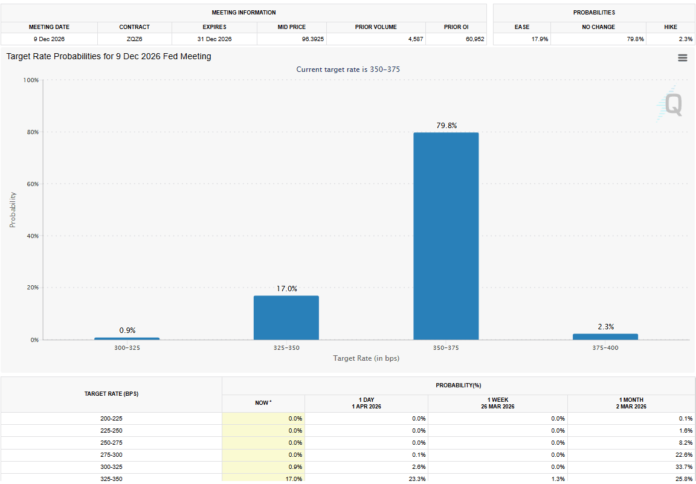 จากข้อมูลของ CME FedWatch Instrument ปัจจุบันตลาดต่างๆ กำลังกำหนดราคาด้วยความน่าจะเป็นประมาณ 80% ที่อัตราดอกเบี้ยนโยบายของ Fed จะยังคงไม่เปลี่ยนแปลงที่ช่วง 3.5%-3.75% ภายในสิ้นปี 2569 ในช่วงต้นเดือนมีนาคม ตลาดคาดการณ์ว่ามีโอกาส 92% ที่ Fed จะปรับลดอัตราดอกเบี้ยนโยบายอย่างน้อยหนึ่งครั้งในปีนี้