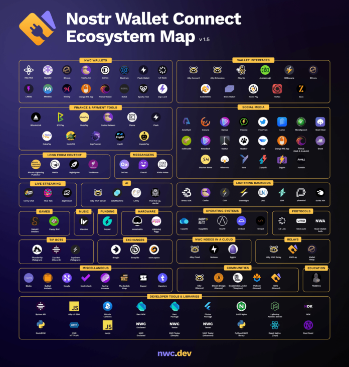 วันนี้ ระบบนิเวศของ NWC รวมถึงแอพและกระเป๋าเงินที่เพิ่มขึ้นจากเกมและเครื่องมือ fintech ไปจนถึงอุปกรณ์ฮาร์ดแวร์ มันได้แยกออกจาก กรณีการใช้งานที่สำคัญของ NOSTR ของแอพโซเชียลมีเดีย–