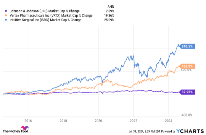 Although Johnson & Johnson stays one of many largest healthcare corporations on the earth by market cap, a number of others may overtake it throughout the subsequent decade. Listed here are two prime candidates: Vertex Prescription drugs (VRTX -2.24%) and Intuitive Surgical (ISRG -0.27%).