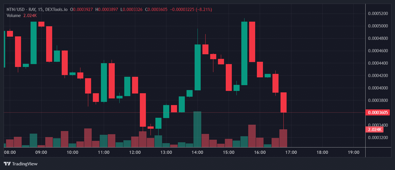 At press time, Nitno’s stay value is $0.000405. It has a market cap of $149.49K and a 24-hour buying and selling quantity of $672.08K. Notably, its quantity noticed a 3,222% improve during the last day. The circulating provide is 364.30M NTN, with a most provide of 470.00M.