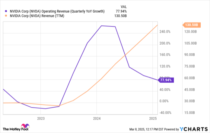 Just like the web within the late Nineties, the hype behind a brand new know-how might create a bubble. Some web shares rocketed greater earlier than crashing when the music (hype) stopped. That would very effectively occur with some AI shares. Nonetheless, Nvidia in all probability is not considered one of them. Nvidia’s inventory has appreciated tremendously over the previous two years, however real enterprise progress has carried the inventory, not hype. Nvidia has generated $130 billion in income over the previous 4 quarters and continues to be rising at almost 80%: