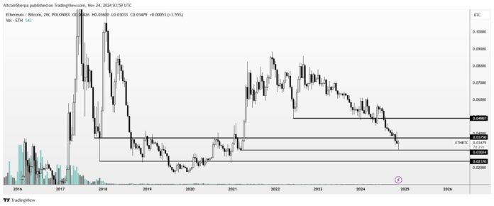 Common crypto analyst Altcoin Sherpa says that Ethereum (ETH) is probably going approaching a cycle backside in its Bitcoin pair (ETH/BTC).