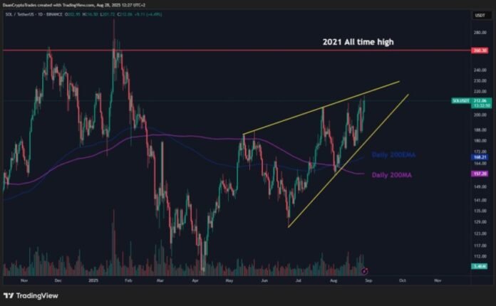 The dealer defined that Solana is buying and selling in a multi-month rising wedge sample, at present nearing the resistance stage that has held over the months. Notably, the cryptocurrency has been rejected from the sample’s higher boundary a number of occasions since July, retesting the ascending assist line on every event.