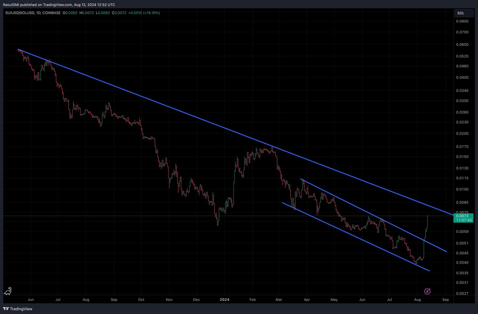 “Clearly, everyone seems to be caught proudly owning zero SUI whereas the value explodes. To show itself worthy of the Subsequent Huge Factor it must correctly show itself vs SOL by breaking the downtrend…. not there but and I’d be shocked if it did it instantly.”