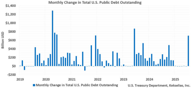 ธนาคารเพื่อการตั้งถิ่นฐานระหว่างประเทศ (BIS) ประมาณการว่าไหลเข้าสู่ stablecoins ลดอัตราผลตอบแทน T-bill 3 เดือนโดย 2 ถึง 2.5 คะแนนพื้นฐานภายใน 10 วันในขณะที่การไหลออกทำให้อัตราผลตอบแทน 6 ถึง 8 คะแนนพื้นฐานในช่วงเวลาเดียวกัน ในรายงาน“Stablecoins และราคาสินทรัพย์ที่ปลอดภัย,” BIS ตั้งข้อสังเกตว่า Stablecoins ตรึงไว้ที่ดอลลาร์สหรัฐและได้รับการสนับสนุนโดย T-bills คล้ายกับกองทุนตลาดเงินมากขึ้นหลังจากการขึ้นเพดานหนี้ 5 ล้านล้านดอลลาร์เพิ่มขึ้น เพิ่มขึ้น ($ 100 พันล้าน) การออก T-bill 4 สัปดาห์ต่อสัปดาห์ ($ 100 พันล้าน) มีบทบาทของ Cryptocurrencies ที่เน้นย้ำในฐานะผู้ให้บริการเงินทุนสำหรับค่าใช้จ่ายของรัฐบาลกลางโดยเฉพาะอย่างยิ่งเมื่อหนี้สาธารณะทั้งหมดสหรัฐฯรวมอยู่ที่ 700 พันล้านดอลลาร์ในเดือนกรกฎาคม 2568 (รูปที่ 1)