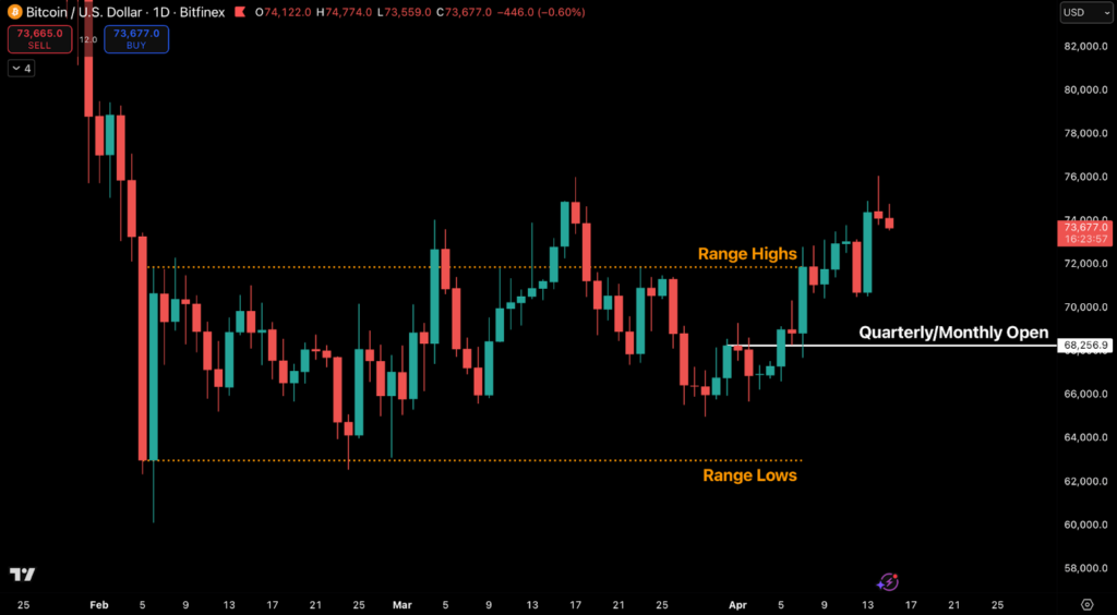 The mid-March ex-dividend cycle, which noticed a brief pause within the “At-The-Market” (ATM) move, coincided with an area worth excessive inside 72 hours. Whereas market consciousness of this mechanic seems visibly heightened, evidenced by funding cooling into the print moderately than aggressively piling in, the chance stays. If post-ex-dividend absorption doesn’t easily transition into sturdy natural spot bidding, the $75,000 stage is the place this range-extension commerce is more likely to fail (as a result of that is the extent the place shopping for stress subsided from close to the day by day shut).