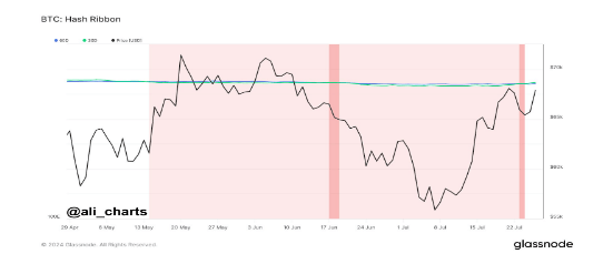 Crypto analyst Ali Martinez highlighted an intriguing phenomenon with the hash ribbon indicator on social media platform X. As famous by the analyst, the hash ribbon is signaling the top of miner capitulation, which means that the BTC worth momentum has shifted from damaging to optimistic.