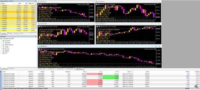 ภาพหน้าจอที่แนบมานี้แสดงกราฟหลายรายการ (IC Markets Normal) โดยมี TickStorm ทำงานอยู่ XAUUSD M1/M5/M15, GBPUSD M1, EURUSD M1– รายการคำสั่งซื้อแสดงการซื้อขายที่ปิดแล้วหลายรายการ คุณจะเห็นส่วนผสมของ Scalping ที่รวดเร็ว โดยไฮไลต์ผู้ชนะและผู้แพ้เล็กน้อย 1 ราย ซึ่งเป็นเรื่องปกติสำหรับเซสชั่น Scalping ที่สมดุล นี่คือพฤติกรรมที่ตั้งใจไว้: การสูญเสียเล็กน้อย/ควบคุมได้ จับโมเมนตัมของผู้ชนะและตัวกรองป้องกันทำงานอยู่