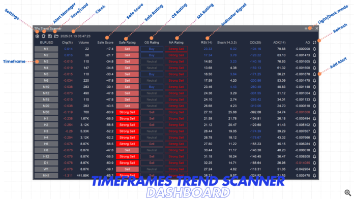เครื่องสแกนเทรนด์กรอบเวลา เป็นตัววิเคราะห์แนวโน้มหรือตัวบ่งชี้คัดกรองแนวโน้มที่ช่วยให้คุณทราบแนวโน้มในกรอบเวลาทั้งหมดของสัญลักษณ์ที่คุณกำลังดูอยู่ ตัวบ่งชี้นี้ให้ผลการวิเคราะห์ที่ชัดเจนและมีรายละเอียดบนแดชบอร์ดที่สวยงาม ช่วยให้คุณใช้ผลลัพธ์นี้ได้ทันทีโดยไม่จำเป็นต้องทำการวิเคราะห์เพิ่มเติม
