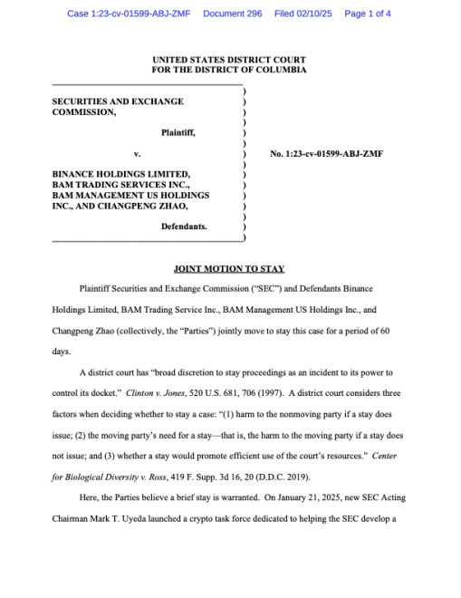 เมื่อวันอังคารที่ผ่านมา Eleanor Terrett นักข่าวธุรกิจฟ็อกซ์ รายงาน ว่าสหรัฐฯและ Binance ได้ร้องขอการหยุดชั่วคราว 60 วันในคดีของผู้ควบคุมต่อการแลกเปลี่ยน crypto ทั่วโลก การเคลื่อนไหวร่วมกันลงวันที่ 10 กุมภาพันธ์ 2568 ระบุว่าการดำเนินคดีรับประกันการเข้าพักเนื่องจากการสร้างกองเรือรบ crypto ของ ก.ล.ต. นำโดยผู้บัญชาการ ก.ล.ต. เฮสเตอร์เพียร์ซ