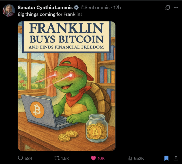 Up to now, nevertheless, there was no official affirmation of state-level Bitcoin purchases. For now, Franklin stays a symbolic turtle with laser eyes at a Bitcoin laptop computer—however in a market hyper-attuned to political indicators, Lummis’ picture is being learn because the clearest trace but that the US may sooner or later be the biggest sovereign Bitcoin purchaser.
