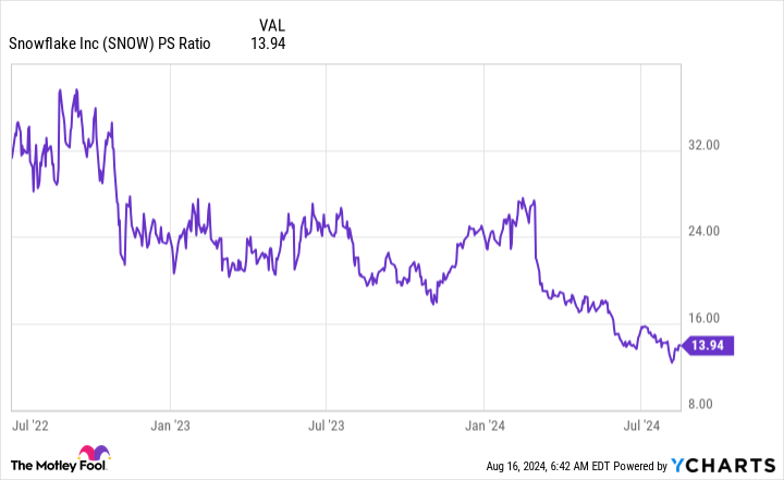 Berkshire is not the one group that has misplaced religion in Snowflake; many extra have headed for the exits, sending the value down. Consequently, Snowflake’s valuation is at an all-time low from a price-to-sales (P/S) standpoint.