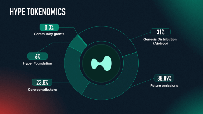 HYPE was launched by way of a considerable community-focused airdrop in late 2024, with 31% of the full 1 billion provide distributed to early customers, making it one of many largest DeFi airdrops up to now. The remaining provide is allotted throughout future emissions (38.888%), core contributors (23.8%), Hyper Basis (6%), and neighborhood grants (0.3%). As of March 2025, HYPE had achieved a market capitalization exceeding $4.4 billion, with roughly 333 million tokens in circulation.
