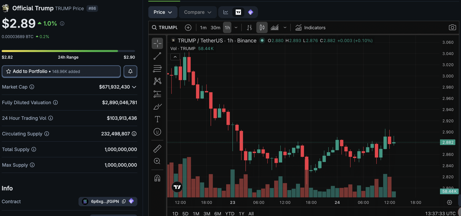 TRUMP is buying and selling right now at $2.85, up a modest +1% on the day, with a 24-hour buying and selling quantity of $103M, and a market cap of $670M, making it the 86th-largest digital asset by valuation.