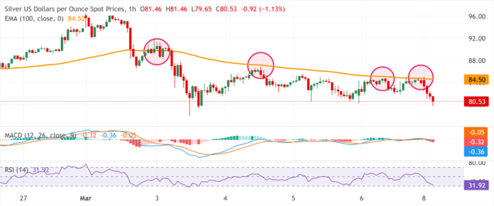ท่ามกลางความล้มเหลวซ้ำแล้วซ้ำเล่าเมื่อเร็วๆ นี้ใกล้กับ Exponential Transferring Common (EMA) 100 ชั่วโมง การยอมรับที่ต่ำกว่าเครื่องหมายจิตวิทยาที่ $80.00 จะถูกมองว่าเป็นตัวกระตุ้นใหม่สำหรับหมี XAG/USD และปูทางไปสู่การขาดทุนที่ลึกยิ่งขึ้น