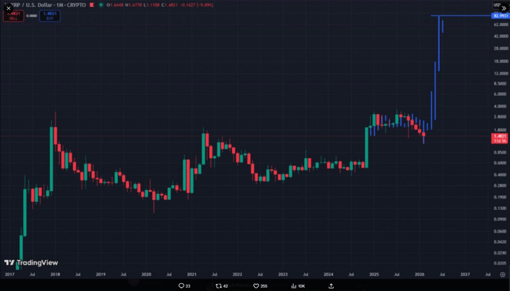 A market commentator generally known as Archie lately posted a chart on X projecting that XRP may climb as excessive as $83 per token earlier than the tip of 2026.