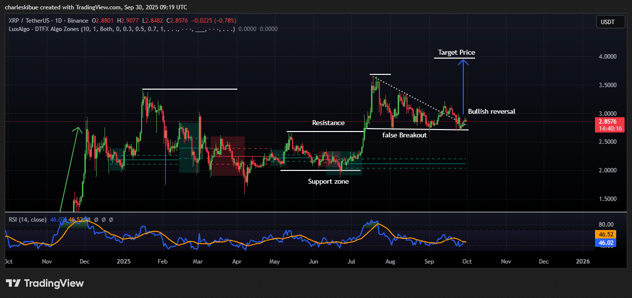 XRP is exhibiting early indicators of a bullish reversal after holding agency at its help zone. The token is at present buying and selling round $2.85, barely down on the day, however the chart suggests consumers are beginning to achieve management once more.
