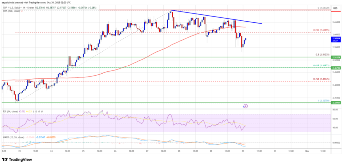 XRP value began a recent enhance above $2.550. The value is now going through hurdles above $2.650 and prone to one other decline within the close to time period.