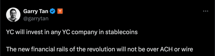 Garry Tan, CEO of Y Combinator, says the corporate will use stablecoins for extra investments.